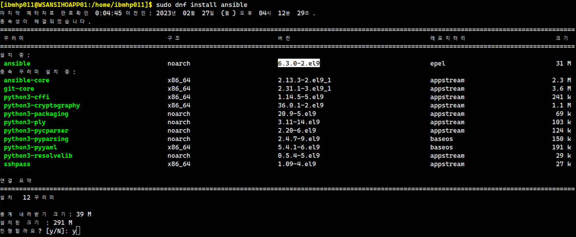 | $ ansible all -m ping 192.168.100.110 | SUCCESS => { "ansible_facts": { "discovered_interpreter_python": "/usr/bin/python3" }, "changed": false, "ping": "pong" } 192.168.100.120 | SUCCESS => { "ansible_facts": { "discovered_interpreter_python": "/usr/bin/python3" }, "changed": false, "ping": "pong" } "pong"이 반환되면 성공이다. |